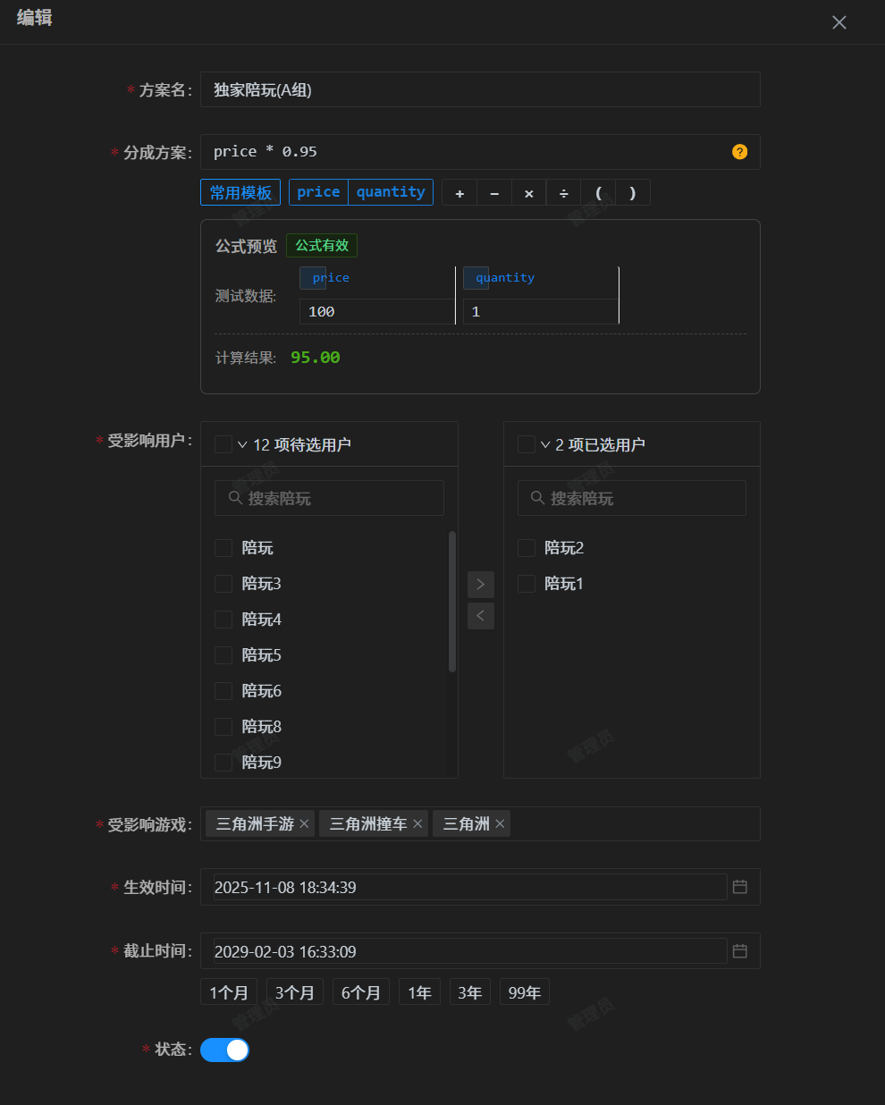 自定义分成方案将会为系统提供一种非常灵活的, 针对个人且可以关联这个人哪些游戏品类受到影响 的强大能力, 让管理者可以根据具体的需求和游戏品类对个人适当调整分成比例。